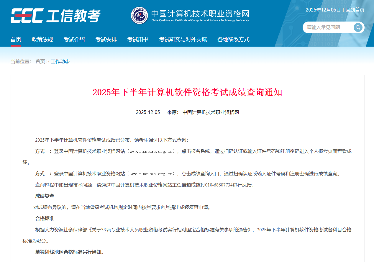 2025年下半年计算机技术与软件专业技术资格(水平)考试成绩已公布,考生可通过以下方式查询: