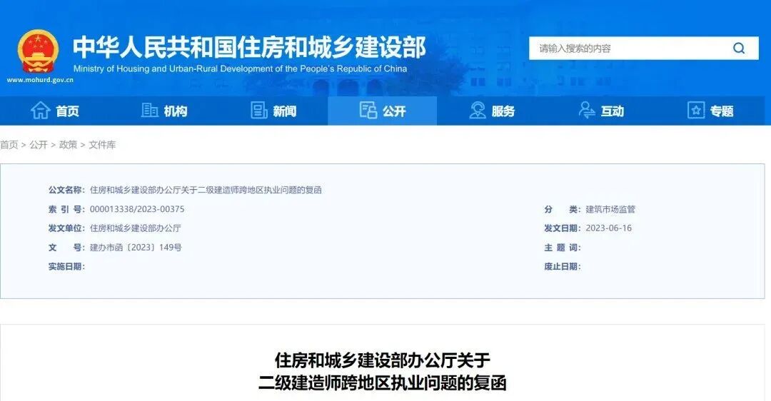 住房和城乡建设部办公厅发布关于二级建造师跨地区执业问题的复函。