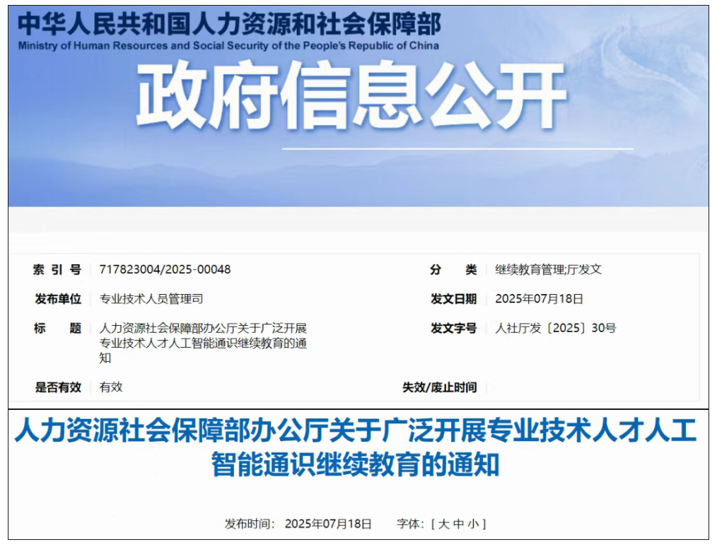 人社部在官网发布了一则《关于广泛开展专业技术人才人工智能通识继续教育的通知》,要求全体专业技术