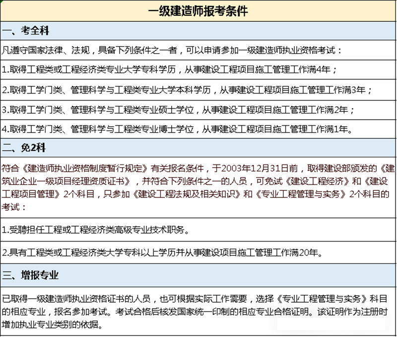 根据中国人事考试网【报考条件】专栏中一级建造师的报考条件,报名参加一级建造师考试,主要分为考全
