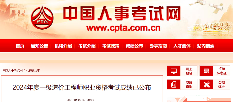 2024年12月23日,中国人事考试网发布了《2024年度一级造价工程师职业资格考试成绩已公布