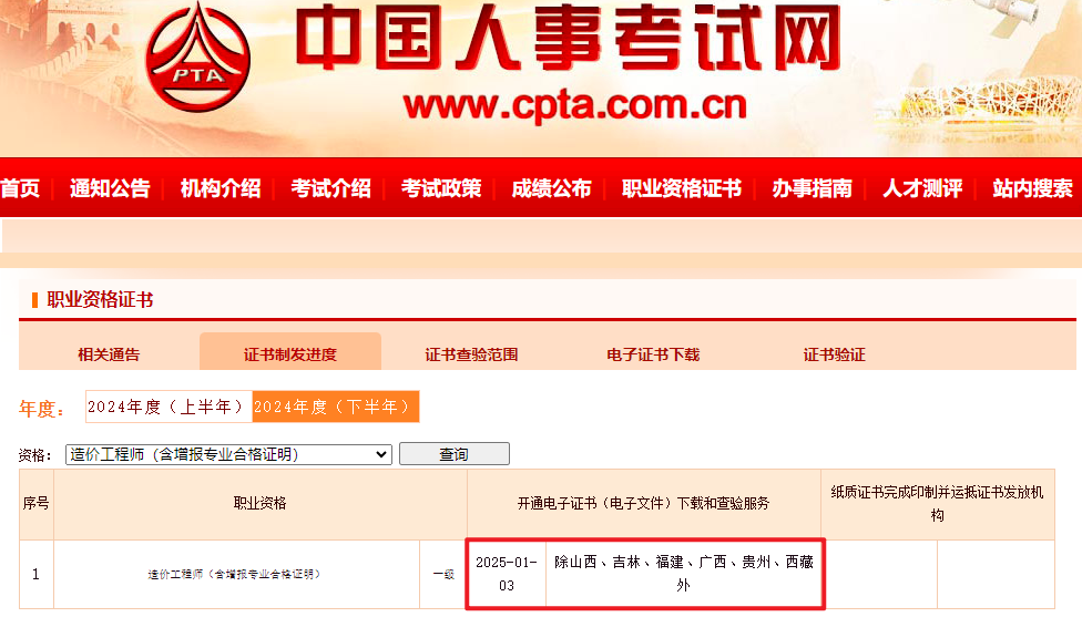 2024年一级造价师考试成绩查询入口为“中国人事考试网”(http://www.cpta.co